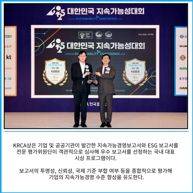 [프라임경제] KB증권은 26일 한국표준협회가 주최한 '2025 대한민국 지속가능성대회'에서 금융부문 '대한민국 지속가능성보고서상(KRCA)'을 수상했다고 27일 밝혔다.