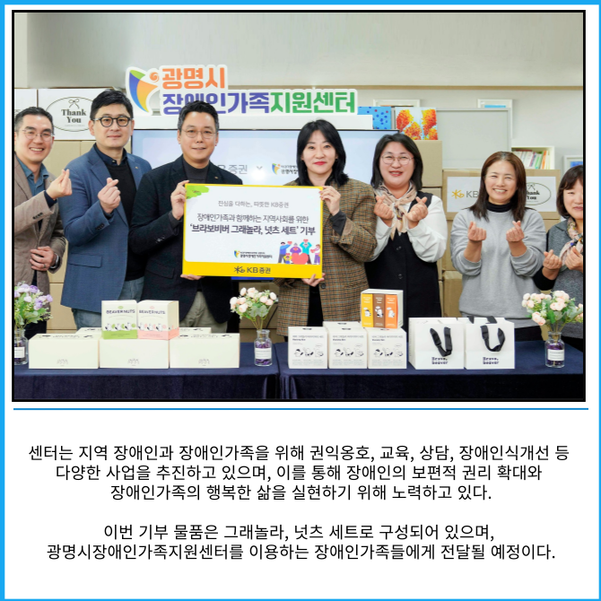 [프라임경제 ]KB증권은 장애인 고용과 자립을 지원하는 사회적 기업인 '브라보비버'에서 생산한 제품을 구매하여 '광명시장애인가족지원센터'에 기부했다고 8일 밝혔다.