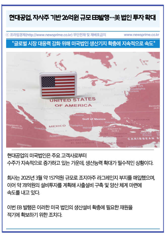 [카드] 현대공업, 자사주 기반 26억원 규모 EB발행…美 법인 투자 확대
