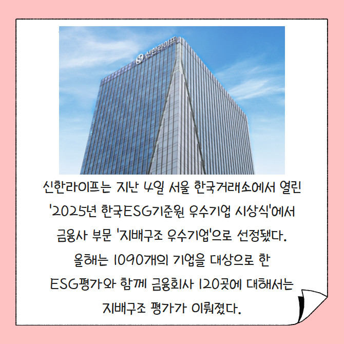 [카드] 신한라이프, 2025 한국ESG기준원 '지배구조 우수기업' 선정