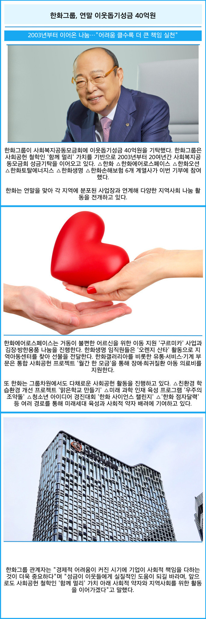 [프라임경제] 한화그룹이 사회복지공동모금회에 이웃돕기성금 40억원을 기탁했다. 한화그룹은 사회공헌 철학인 '함께 멀리' 가치를 기반으로 2003년부터 20여년간 사회복지공동모금회 성금기탁을 이어오고 있다. △한화 △한화에어로스페이스 △한화오션 △한화토탈에너지스 △한화생명 △한화손해보험 6개 계열사가 이번 기부에 참여했다.