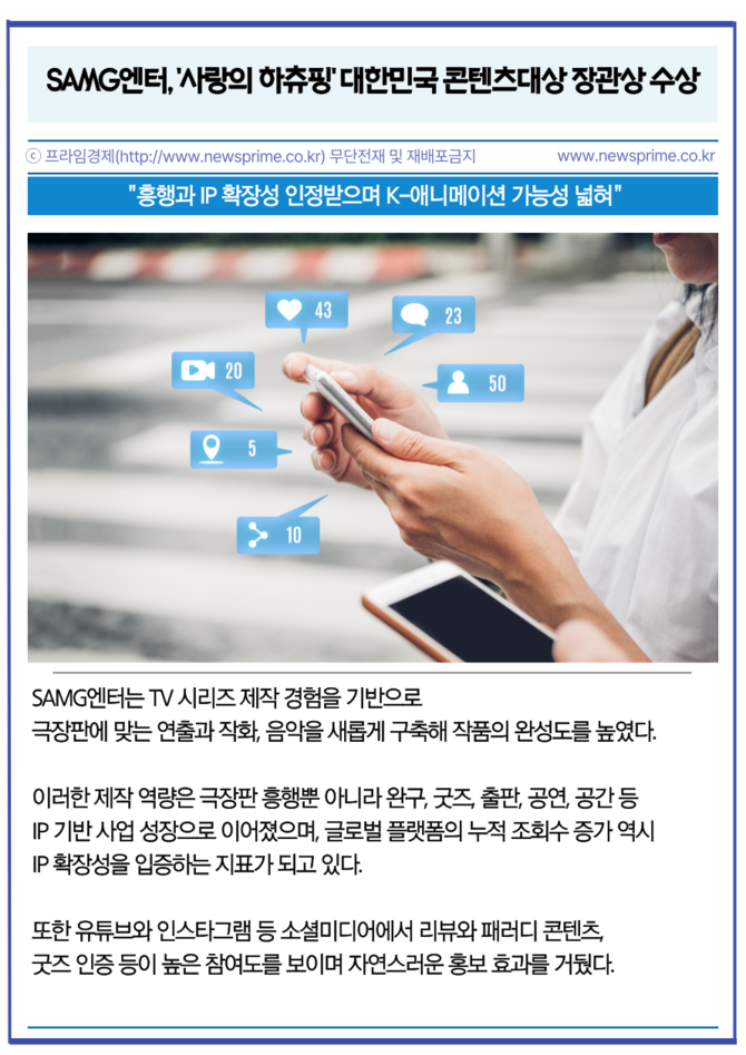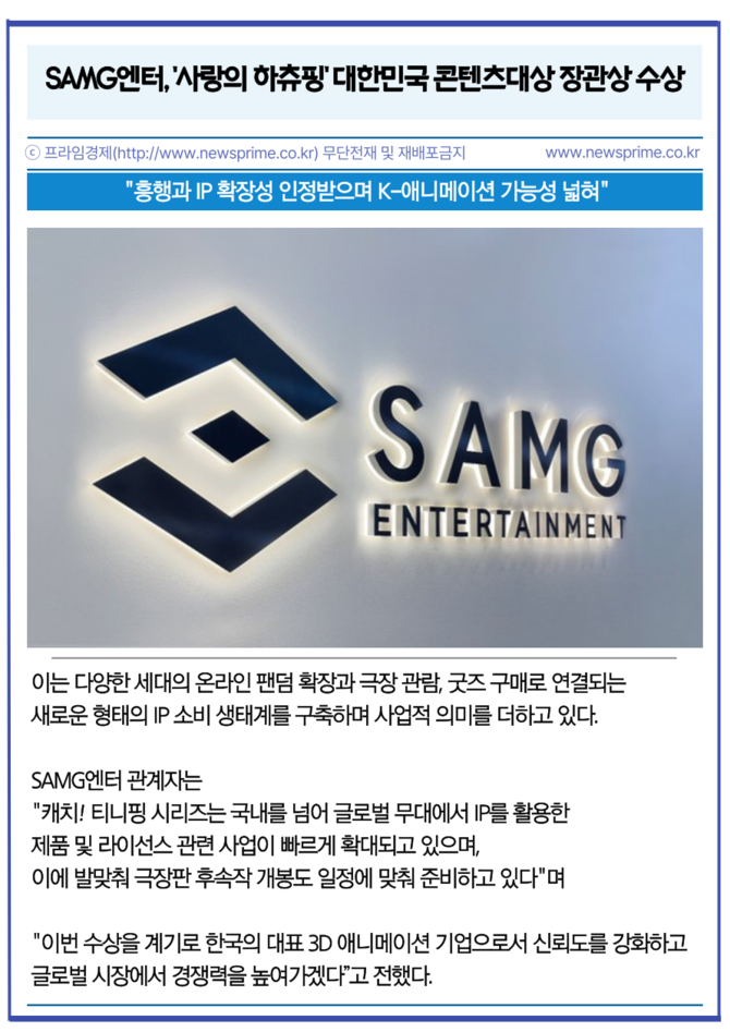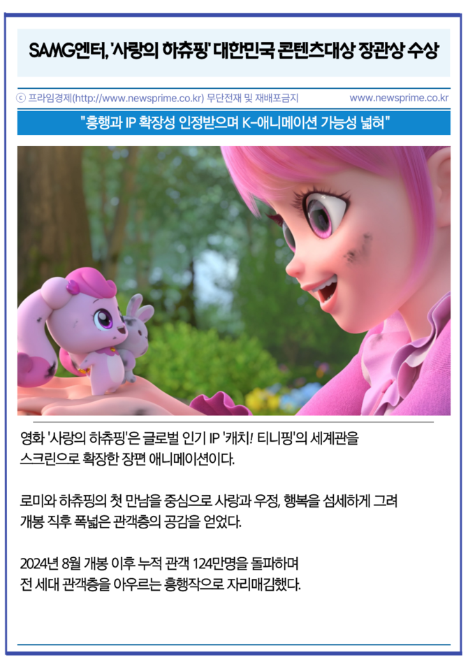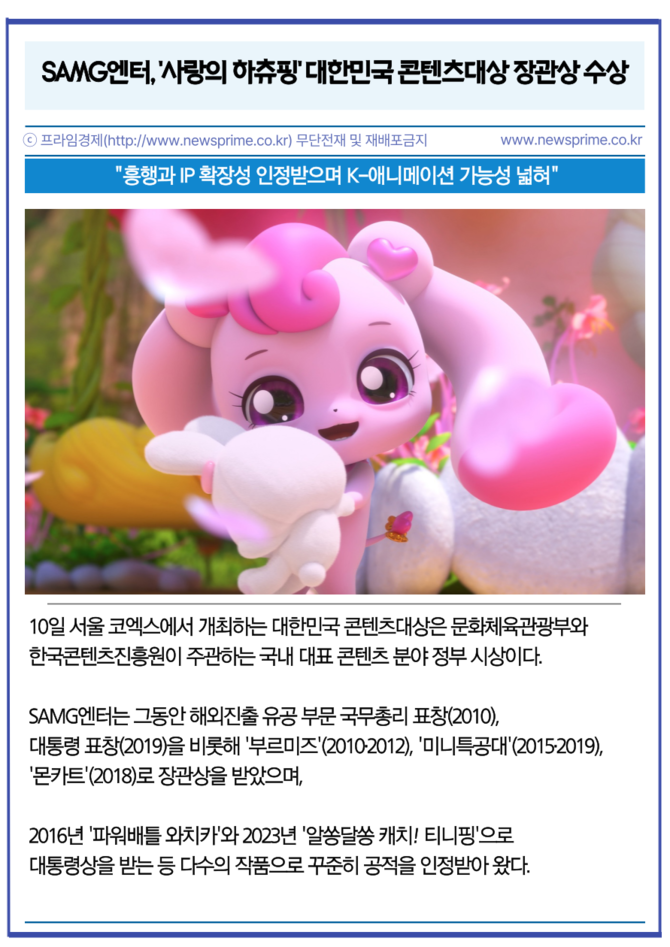 [프라임경제] 글로벌 IP 콘텐츠 기업 에스에이엠지엔터테인먼트(419530, 이하 SAMG엔터)는 자사의 극장판 애니메이션 '사랑의 하츄핑'이 2025년 대한민국 콘텐츠대상 문화체육관광부 장관상 수상작으로 선정됐다고 10일 밝혔다.
