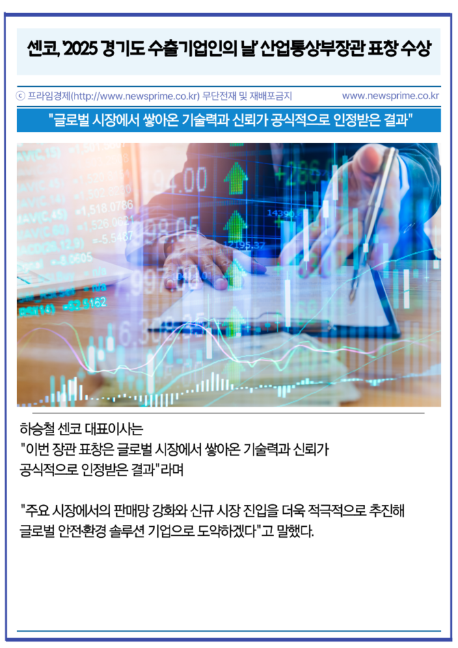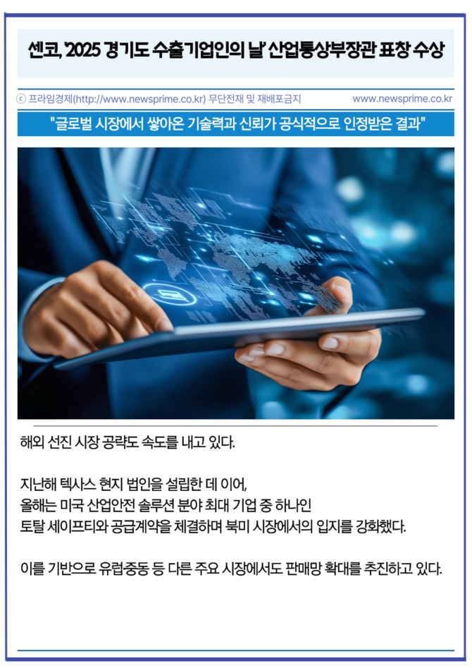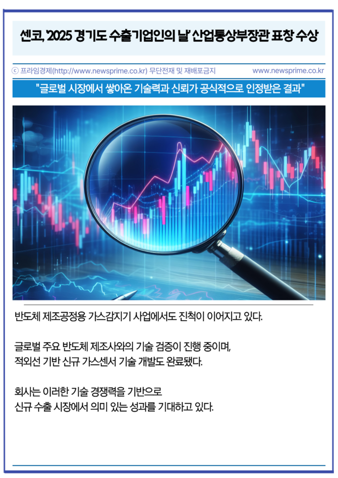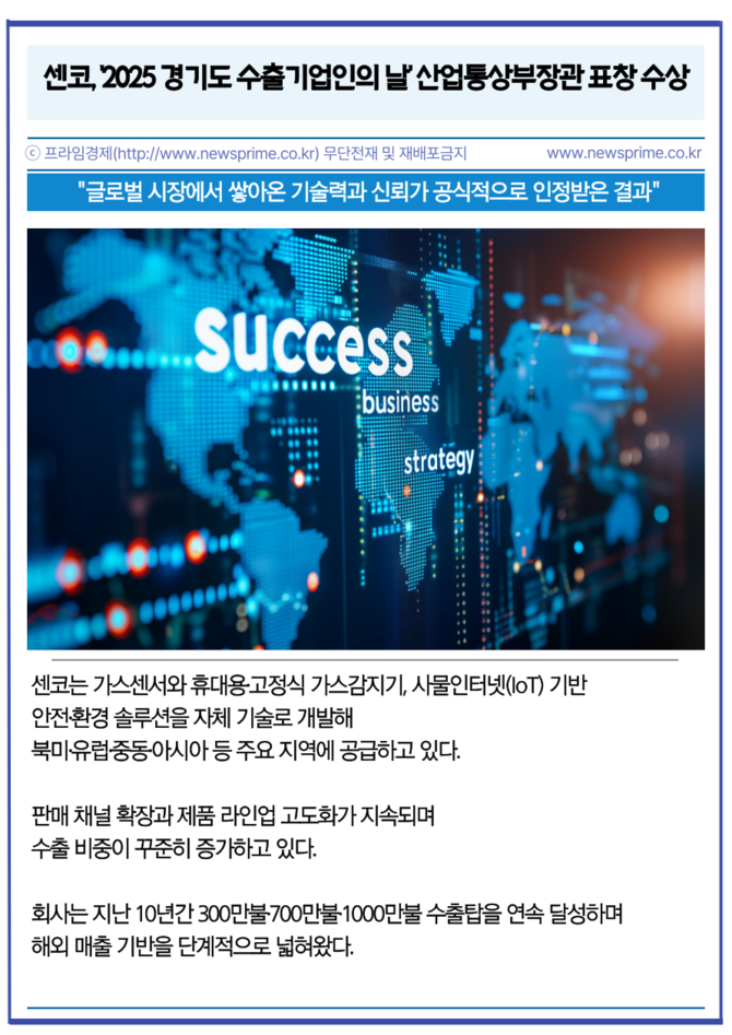 [프라임경제] 가스 센서 토탈 솔루션 기업 센코(347000)는 '2025 경기도 수출기업인의 날' 기념식에서 산업통상자원부 장관 표창을 수상했다고 10일 밝혔다. 글로벌 경기 둔화 속에서도 해외 시장에서 꾸준한 성장세를 이어오며 수출 경쟁력을 강화해온 점이 높은 평가를 받았다.