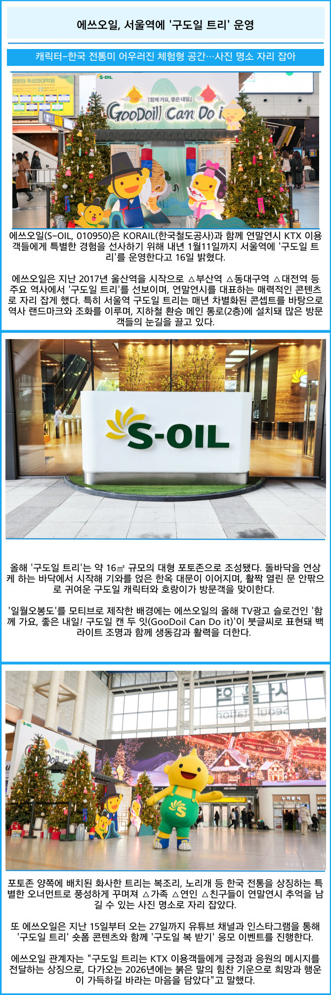 [프라임경제] 에쓰오일(S-OIL, 010950)은 KORAIL(한국철도공사)과 함께 연말연시 KTX 이용객들에게 특별한 경험을 선사하기 위해 내년 1월11일까지 서울역에 '구도일 트리'를 운영한다고 16일 밝혔다.