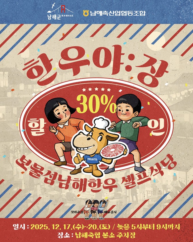 남해군은 연말을 맞아 지난 17일부터 20일까지 4일간, 매일 오후 5시부터 9시까지 남해축협 본소 주차장에서 '한우야:장(보물섬남해한우 셀프식당)'을 운영한다고 18일 밝혔다.