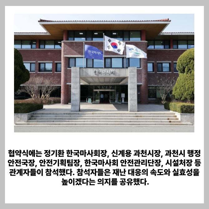 [프라임경제] 한국마사회(회장 정기환)와 과천시(시장 신계용)가 재난과 안전사고 예방을 위해 협력 체계를 강화한다고 22일 밝혔다.