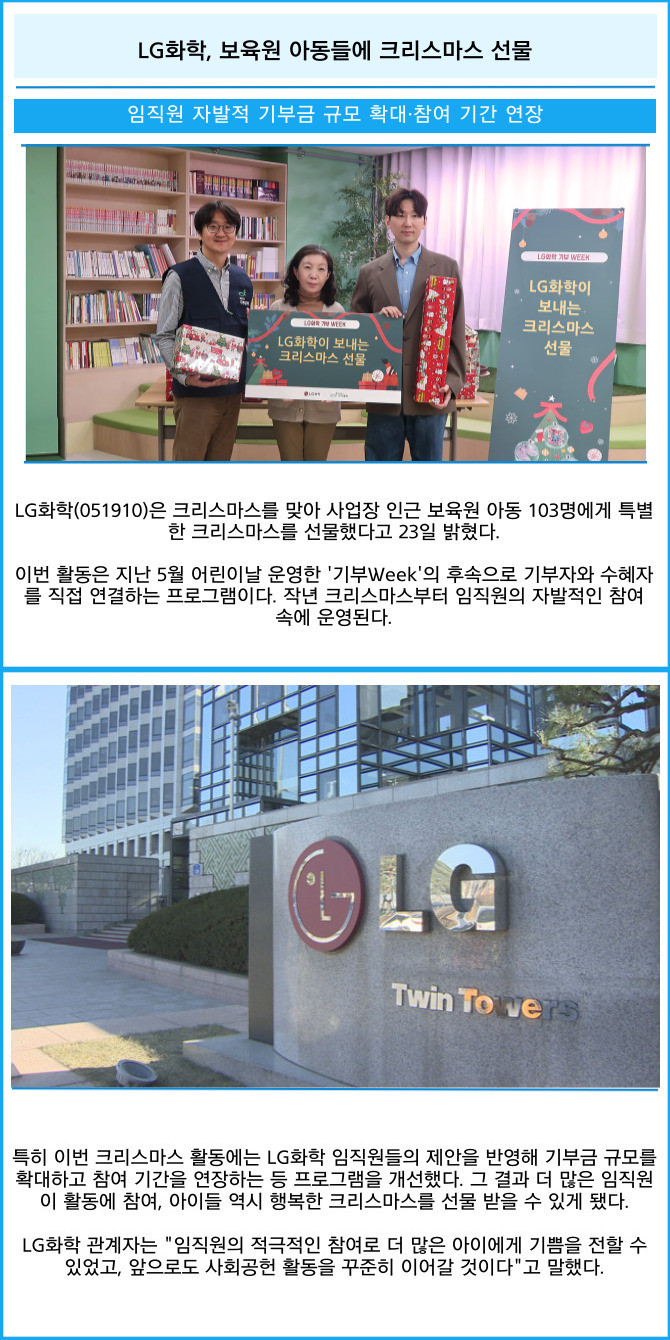 [프라임경제] LG화학(051910)은 크리스마스를 맞아 사업장 인근 보육원 아동 103명에게 특별한 크리스마스를 선물했다고 23일 밝혔다.