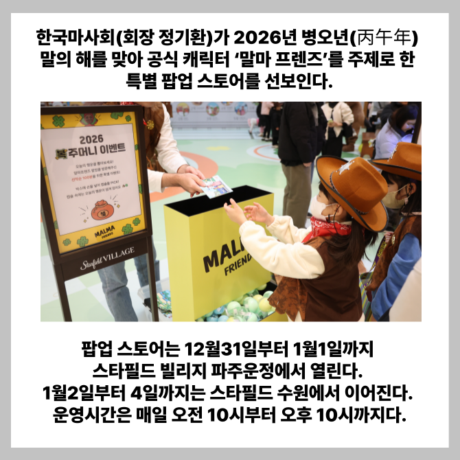 [프라임경제] 한국마사회(회장 정기환)가 2026년 병오년(丙午年) 말의 해를 맞아 공식 캐릭터 ‘말마 프렌즈’를 주제로 한 특별 팝업 스토어를 선보인다.
