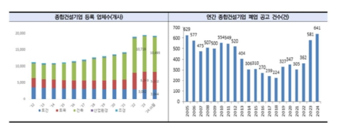 건설산업지식정보시스템에 따르면 지난해 11월 기준 폐업한 종합건설업체는 452곳으로, 전년 동기 대비 증가했다. 2022년과 2023년에도 각각 261곳과 418곳의 종합건설업체가 폐업했다.