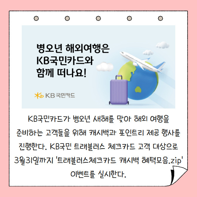 [프라임경제] KB국민카드가 병오년 새해를 맞아 해외 여행을 준비하는 고객들을 위해 캐시백과 포인트리 제공 행사를 진행한다. KB국민 트래블러스 체크카드 고객 대상으로 3월31일까지 '트래블러스체크카드 캐시백 혜택모음.zip' 이벤트를 실시한다.
