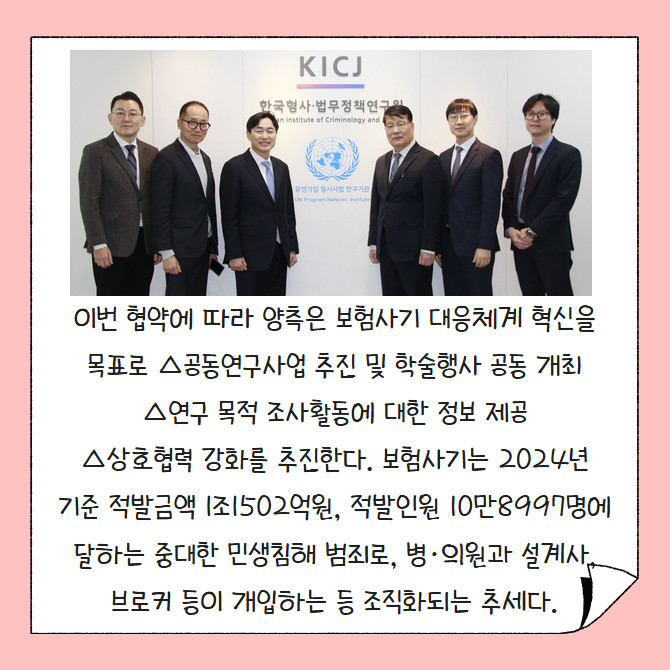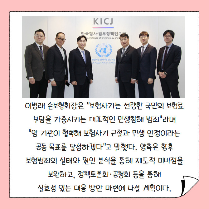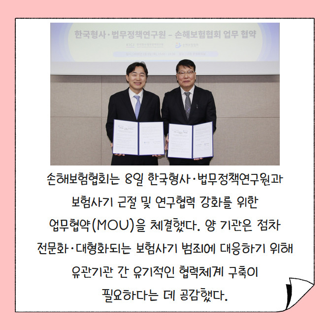 [프라임경제] 손해보험협회는 8일 한국형사·법무정책연구원과 보험사기 근절 및 연구협력 강화를 위한 업무협약(MOU)을 체결했다. 양 기관은 점차 전문화·대형화되는 보험사기 범죄에 대응하기 위해 유관기관 간 유기적인 협력체계 구축이 필요하다는 데 공감했다.