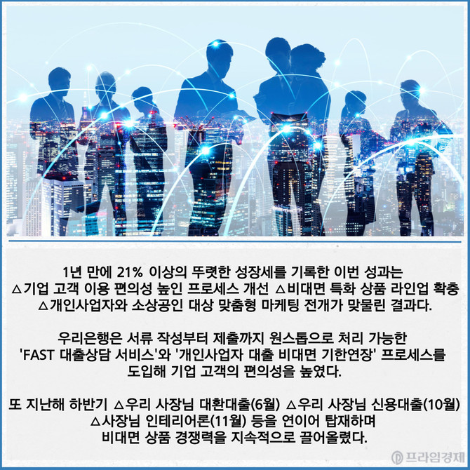 [프라임경제] 우리은행 기업금융 특화 플랫폼 '우리WON기업'의 월간활성이용자(MAU)가 지난해 말 기준 17만8000명을 돌파했다.