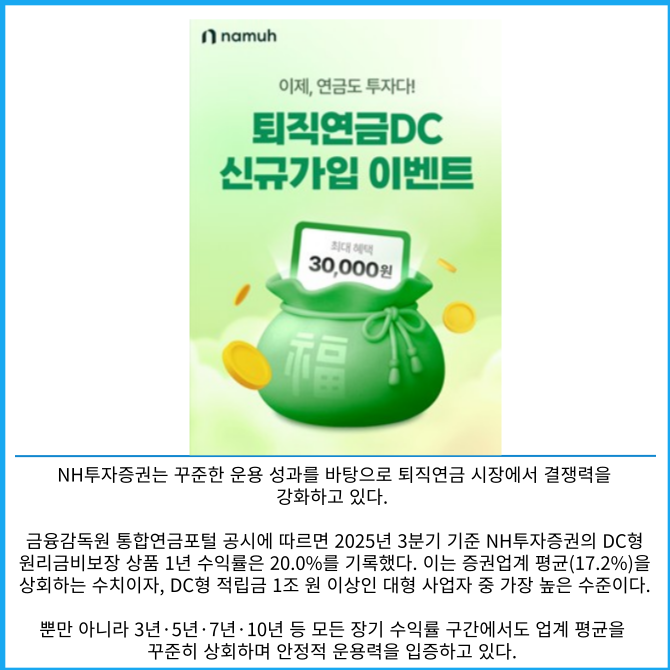 [프라임경제] NH투자증권(005940)은 고용노동부 주관 '2025년 퇴직연금사업자 평가'에서 2년 연속 우수사업자로 선정된 것을 기념해 오는 3월31일까지 퇴직연금 확정기여형(DC형) 신규가입 이벤트를 진행한다고 14일 밝혔다.