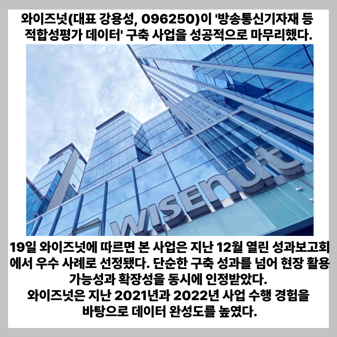 [프라임경제] 와이즈넛(대표 강용성, 096250)이 '방송통신기자재 등 적합성평가 데이터' 구축 사업을 성공적으로 마무리했다. 과학기술정보통신부가 주관하고 한국지능정보사회진흥원(NIA)이 지원하는 초거대AI 확산 생태계 조성 사업의 일환이다.