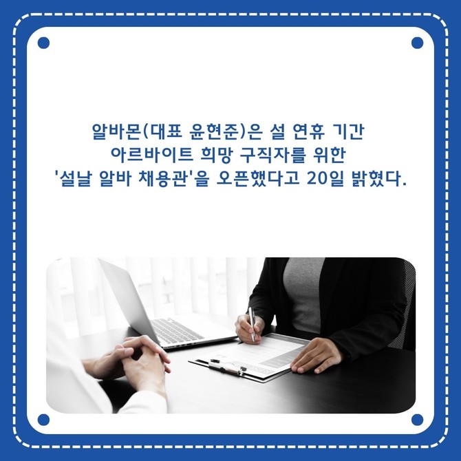 [프라임경제] 알바몬(대표 윤현준)은 설 연휴 기간 아르바이트 희망 구직자를 위한 '설날 알바 채용관'을 오픈했다고 20일 밝혔다.