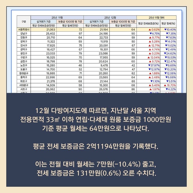 [프라임경제] 다방은 지난해 12월 기준 서울 지역의 전용면적 33㎡ 이하 연립·다세대 원룸의 25개 자치구별 전월세 수준을 분석한 '12월 다방여지도'를 발표했다고 22일 밝혔다.