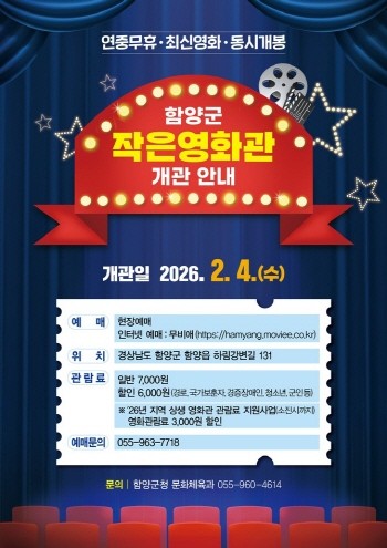 함양군 관계자는 "작은 영화관이 군민의 일상 속 쉼터이자 세대를 잇는 문화공간이 되길 기대한다"며 "앞으로도 군민이 체감할 수 있는 문화 인프라 확충에 힘쓰겠다"고 말했다.