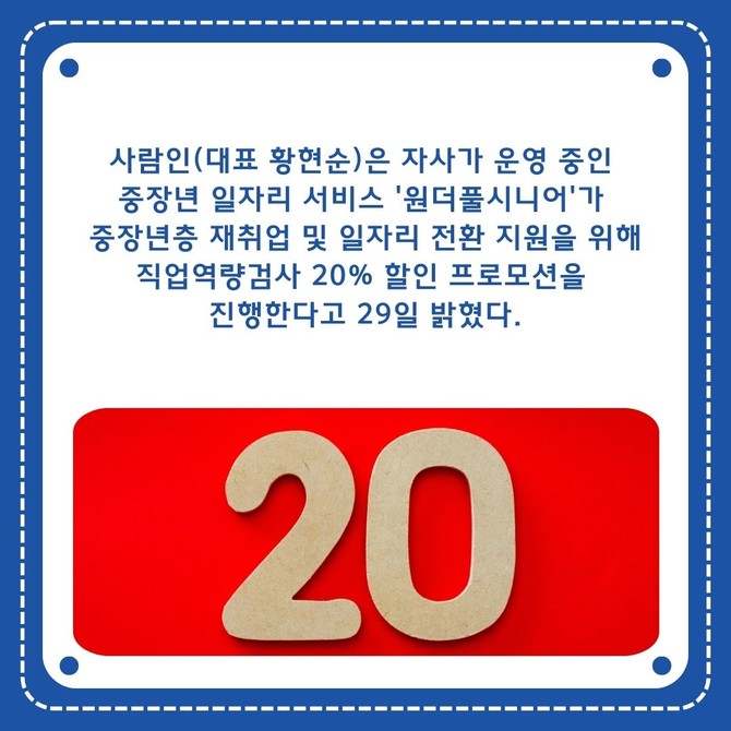 [프라임경제] 사람인(대표 황현순)은 자사가 운영 중인 중장년 일자리 서비스 '원더풀시니어'가 중장년층 재취업 및 일자리 전환 지원을 위해 직업역량검사 20% 할인 프로모션을 진행한다고 29일 밝혔다.