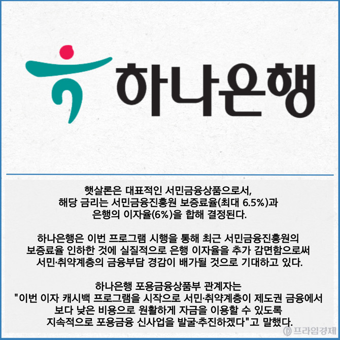[프라임경제] 하나은행이 서민·취약계층 금융부담 경감 지원을 위해 '햇살론 이자 캐시백 프로그램'을 시행한다고 29일 밝혔다.