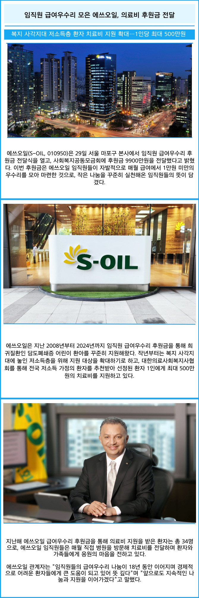 [프라임경제] 에쓰오일(S-OIL, 010950)은 29일 서울 마포구 본사에서 임직원 급여우수리 후원금 전달식을 열고, 사회복지공동모금회에 후원금 9900만원을 전달했다고 밝혔다. 이번 후원금은 에쓰오일 임직원들이 자발적으로 매월 급여에서 1만원 미만의 우수리를 모아 마련한 것으로, 작은 나눔을 꾸준히 실천해온 임직원들의 뜻이 담겼다.