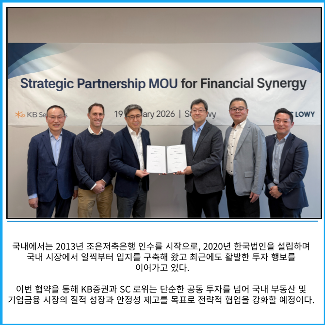 [프라임경제] KB증권은 지난 19일 글로벌 투자사 SC 로위(SC Lowy)와 부동산과 기업금융 분야에서 금융 시너지를 창출하기 위한 전략적 업무협약(MOU)을 체결하고 국내 시장에서의 공동 투자 기회 발굴을 본격화한다고 29일 밝혔다.