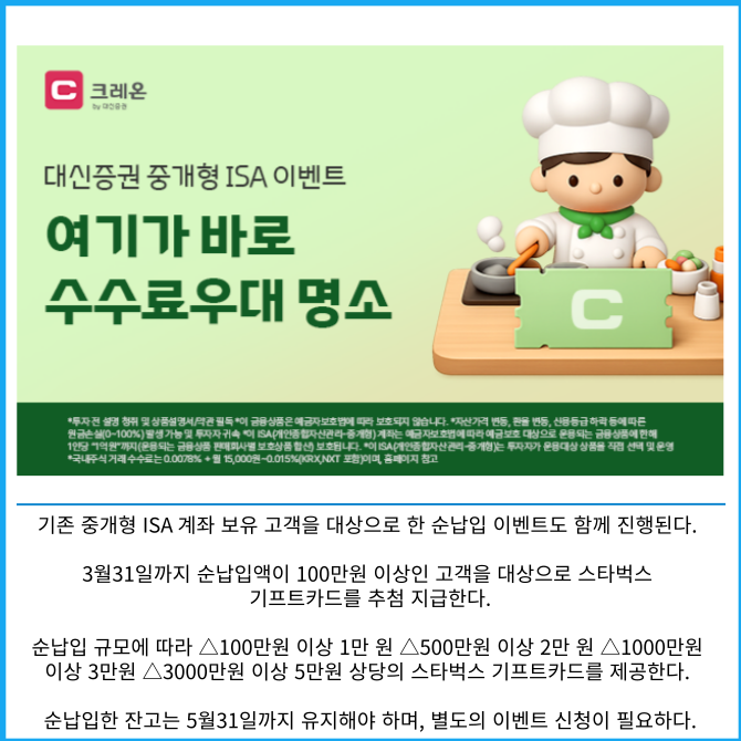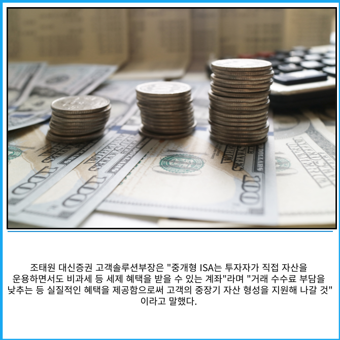 [프라임경제] 대신증권(003540)은 중개형 개인종합자산관리계좌(ISA) 고객을 대상으로 국내주식 거래 수수료 우대와 순납입 이벤트를 실시한다고 29일 밝혔다.