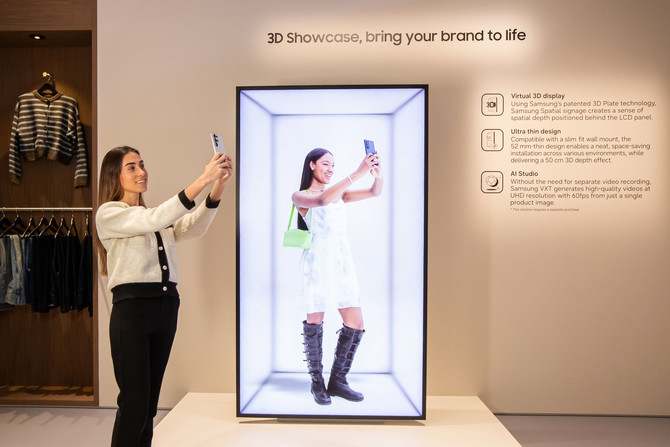 스페이셜 사이니지는 삼성전자의 독자 기술인 '3D 플레이트'를 적용해 두께 52㎜의 초슬림 디자인에서도 깊이감 있는 3D 공간감을 구현한 것이 특징이다. 이를 통해 신발, 의류 등 전시 제품이나 제품을 착용한 모델의 정면·측면·후면을 아우르는 360도 회전 영상을 실감나게 구현할 수 있다.