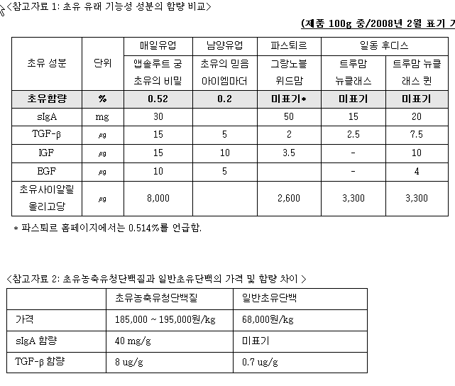 일반초유단백을 사용할 경우 Kg당 68,000원인 반면 매일유업에서는 일반초유단백 이외에도 4가지의 초유원료인 농축유청단백질(TGF-β 함유), 초유농축유청단백질(sIgA 함유), 유기농초유고단백분말(IGF, IgG, EGF 함유), 초유사이알릴올리고당을 사용하였으며 이는 Kg당 185,000 ~ 195,000원인 고가의 초유농축원료로 초유함량은 적을 수 있으나 그 성분에 있어서는 질적으로 우수하다고 전했다. 실제 매일유업이 사용한 초유농축유청단백질은 초유 성장인자 TGF-β가 일반 초유단백에 비하여 10배 가까이 높다.