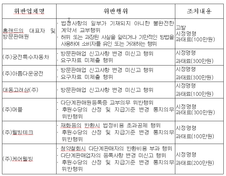 또 웰빙테크는 재화등의 반환시 법정비용 초과공제 행위, 케어웰빙은 청약철회시 다단계판매자의 반환비용 부과 행위와 다단계판매업자의 등록사항 변경 미신고 행위, 머플은 다단계판매원등록증 교부의무 위반행위를 했다. 이외에도 웰빙테크, 케어웰빙, 머플 등 3개사는 후원수당의 산정 및 지급기준 변경 통지의무를 위반했다.