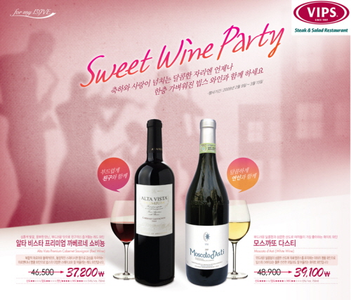[프라임경제] 빕스(www.ivips.co.kr)는 사랑하는 사람과 함께 즐기기에 좋은 달콤한 발포성 와인, ‘알타 비스타 프리미엄 까베르네 쇼비뇽’와 ‘모스까또 다스띠’를 20% 할인된 가격에 판매하는 스위트 와인 파티(Sweet Wine Party)행사를 오는 9일부터 3월 15일까지 실시한다고 전했다.