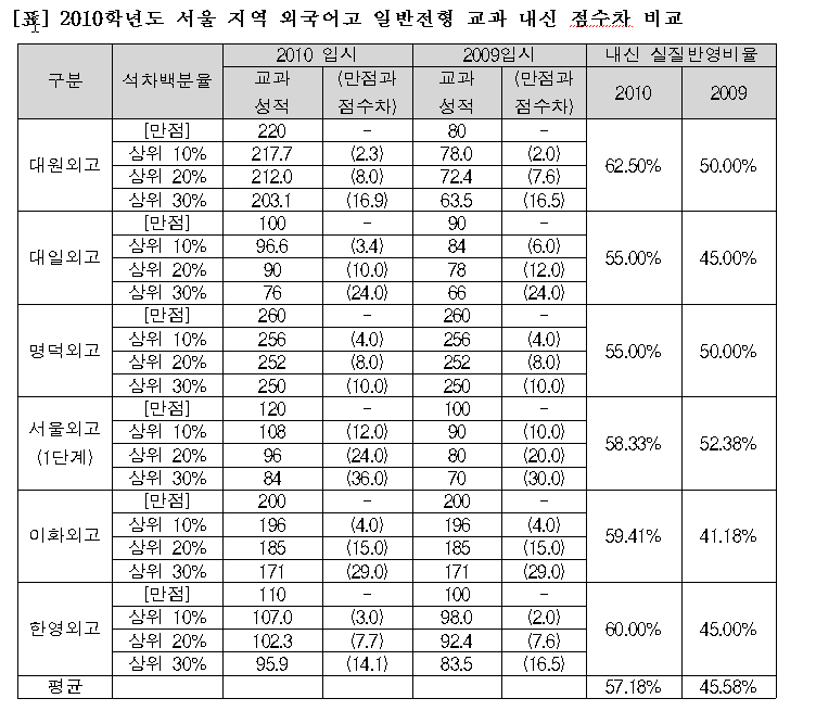 반면에 서울외고는 1단계 내신 실질반영비율이 58.33%로 작년과 비교하여 5.95% 증가하였는 데, 교과성적 상위 10%의 만점과 점수차는 12점, 상위 20%의 점수차는 24점으로 반영 비율만큼 증가하였다.