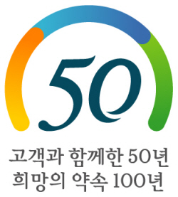 기념 엠블럼은 '약속'을 상징하는 무지개를 모티브로 하는 삼색 원 안에 50주년을 의미하는 숫자 '50'을 넣어 '고객과 함께한 50년, 희망의 약속 100년'이라는 슬로건을 시각적으로 전달할 수 있도록 했다.
