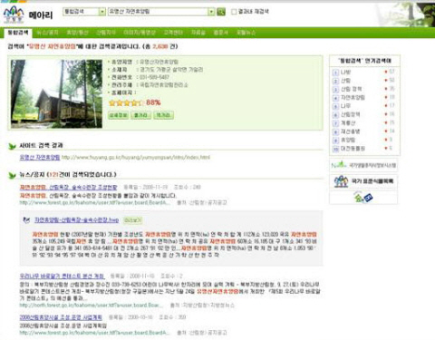 예를 들어 새봄 나들이를 위하여 ‘유명산 자연휴양림’을 검색한 네티즌은 휴양림은 물론 주변 관광 정보까지 포탈처럼 한 번에 검색할 수 있다. 겨울방학 숙제 준비로 장수풍뎅이를 검색하는 어린이 네티즌도 테마검색을 이용하여 손쉽게 정보를 얻을 수 있다.