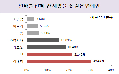 아르바이트 구인·구직 포털 '알바천국' 에서는 구직자 1027명을 대상으로 ‘알바를 전혀 안 해봤을 것 같은 연예인’ 설문을 실시한 결과 1위는 김태희(30%)인 것으로 나타났다. 그 뒤로 꽃보다남자F4(21%)-강호동(18%)- 소녀시대(15%) _빅뱅(6%)-이효리(5%)-조인성(3%) 순이었다.