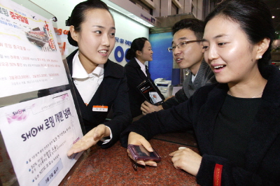 | <KTF 로밍센터에서 고객이 일본 현지번호를 추가로 받아 저렴하게 로밍서비스를 사용할 수 있는 ‘쇼 로밍 저팬넘버’ 서비스에 대한 안내를 받고 있다.> | ||