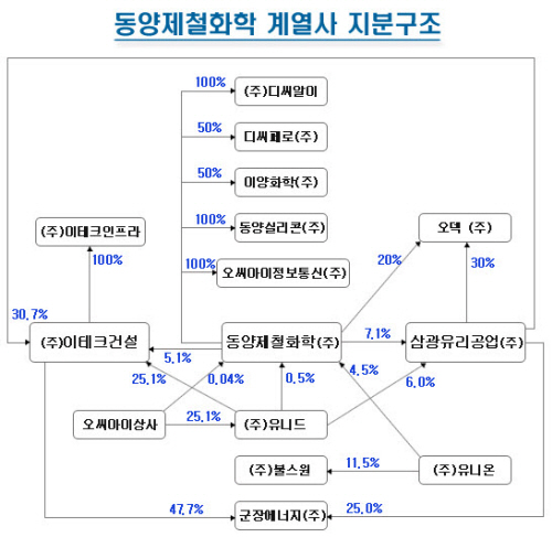 지주사 격인 동양제철화학(주)의 경우 가장 많은 출자 계열사 수를 자랑하고 있는 가운데 삼광유리공업(주) 7.1%, 이테크건설(주) 5.1%, 동양실리콘(주) 100% 등 8개 계열사의 지분을 보유하고 있는 상황이어서 최대주주인 이수영 회장의 안정된 그룹 장악 능력을 뒷받침 해주고 있다.