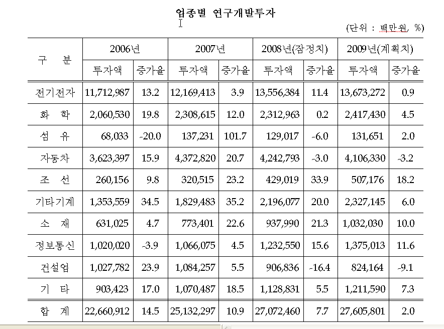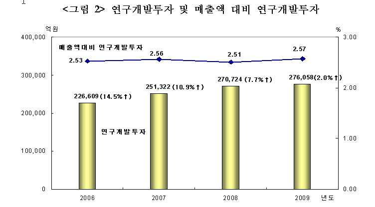 특히, 금년도 대기업의 연구개발투자가 전년보다 소폭 감소(-1.2%)할 것으로 예상되는 데 비해 중소기업은 11.4%의 증가율을 보이고 있다. 중소기업의 연구개발투자 증가율이 높게 나타나는 것은 2005년 이후 중소기업을 중심으로 한 기업부설 연구소의 꾸준한 증가에 기인한다.
