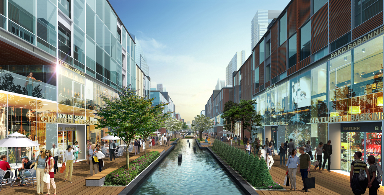 800m에 달하는 스트리트에는 수로를 따라 블록별 다양한 시설들과 예술 조형물, 야외 수상무대 등이 설치돼 문화와 쇼핑이 공존하는 공간으로 조성된다.