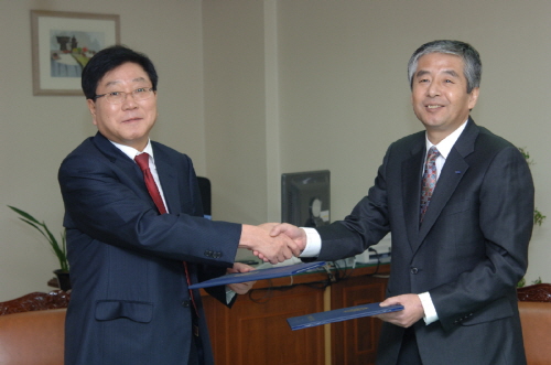 | < 사진 = 곽영균 KT&G 사장(사진 왼쪽)과 전영길 노조위원장이 노사 공동 협약서 교환 후 악수하는 모습 > | ||