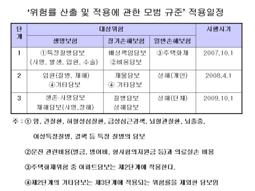 지난 1, 2단계에서 시행된 위험률 모범규준은 생명보험은 암ㆍ질환ㆍ급성심근경색ㆍ뇌혈관질환ㆍ뇌졸중ㆍ여성특정질병ㆍ결핵 등 특정 질병과 관련된 입원ㆍ수술ㆍ사망 등의 보험료가 지난 위험률 산출표에 따라 손해율에 맞춰 상향 조정된 바 있다.