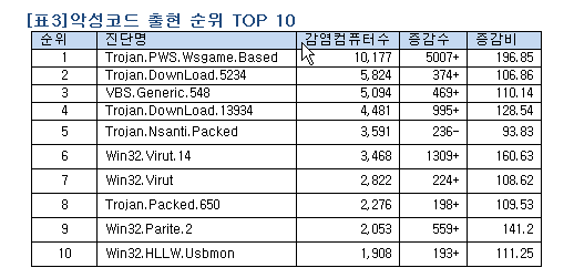 「악성코드 출현 순위 Top 10」을 살펴보면 트로이목마와 스크립트 악성코드가 상위 랭킹을 차지하고 있는데, 웹사이트 해킹을 통한 트로이목마의 감염 피해는 여전히 지속되고 있음을 알 수 있다.