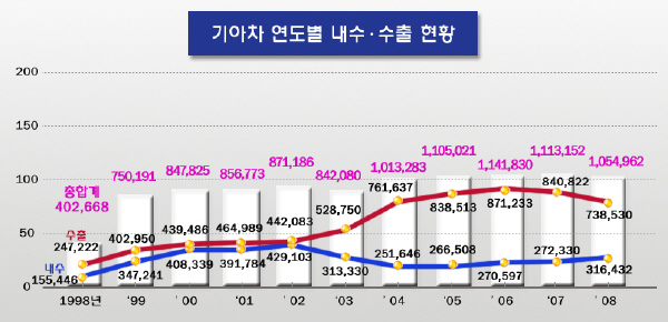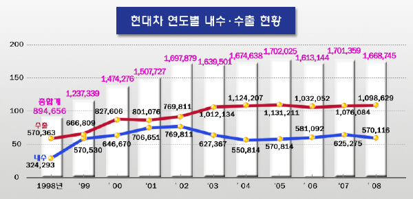여기에 인도, 터키, 중국, 미국, 슬로바키아 등 곳곳의 해외 생산 공장의 활발한 가동 덕분에 현대·기아차의 해외 생산능력은 303만대에 이르렀다. 그만큼 생산 네트워크 구축에 충실했던 정 회장의 글로벌 경영에 중점을 둔 덕이다.