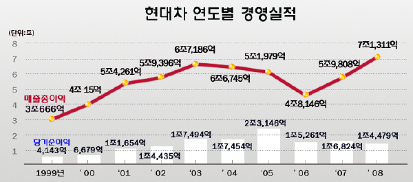 1999년 정 회장이 취임 첫해 3조 666억원 이라는 매출 총이익을 발생 시키며 탁월한 경영방침이 적중하기 시작했다. 다만 2005~2006년 사이 정몽구 회장의 진두지휘 아래 가장 큰 노조 파업의 여파로 잠시 주춤 한 것을 제외한다면, 지속정인 성장세를 기록한 것으로 나타난다. 더욱이 지나해에는 매출 총이익이 7조11311억원에 달해 2.5배 이상 늘었다.