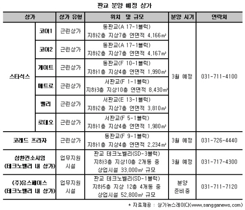 3월 중으로 판교 내 6개 근린 상가로 구성된 ‘스타식스’가 분양을 시작하고, 삼환컨소시엄이 시행하는 판교 테크노벨리 SD-3 내 상업시설과 동판교 내 근린상가인 코레드 프라자 등도 3월 분양을 준비중이며 테크노벨리 내 최대 규모인 (주)유스페이스의 SD-1도 공급을 준비중이다.