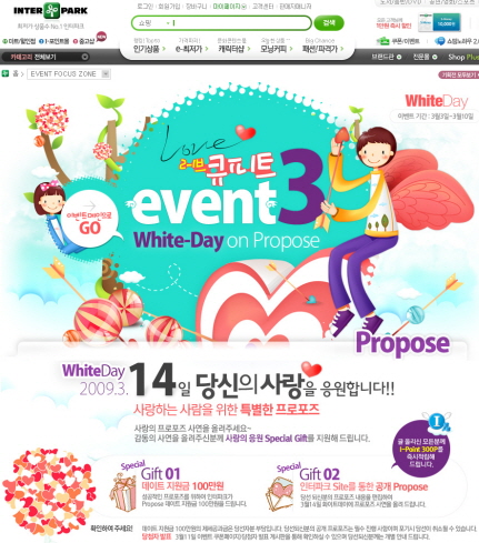 www.interpark.com)는 감동의 사연을 올린 회원 중 네티즌 추천 및 심사를 통해 한 커플에게 100만원의 프로포즈 비용을 지원 해 주는 ‘러브 큐피트’ 이벤트를 3월 10일까지 진행한 결과 그 호응이 뜨거웠다. 3월 11일 네티즌 추천 및 심사를 통해 당선 커플을 발표했으며 당선된 한 커플에게 100만원 프로포즈 지원금은 물론, 3월 14일 화이트데이 당일 날 인터파크 사이트 메인 화면에서 공개 프로프즈 기회를 제공할 예정이다. 그 외 아쉽게 탈락한 다섯 커플에게는 영화예매권을 증정한다. 구매 여부 상관없이 누구나 참여할 수 있었던 ‘러브 큐피트’ 이벤트는 단 몇 일 만에 총 1805개의 사연이 올라오는 등 뜨거운 반응을 보였다. 특히 높은 경쟁률을 뚫고 당선된 사연의 주인공 ID jungso09** 고객은 「3년의 결혼생활 중 결혼반지를 빼고 금 반지를 끼워야 했던 힘든 순간도 있었지만 남은 세월 동안 더욱더 아껴주며 서로 든든한 버팀목이 되자」고 사연에서 밝혀 배우자에 대한 변함없는 사랑을 표현했다. 이 외에도 ID jun75** 고객의「이번 화이트데이에 내 평생의 반쪽이 되어 주었으면 해」, ID kimgg** 고객의「여자친구 부모님의 반대가 심해서 허락 받을 수 있게 힘을 주세요」, ID vip** 고객의「한 때 남자친구가 있었던 그녀를 3년 동안 좋아하다 용기를 내어 고백하려 해요..」등 감동의 글들이 가득했다. 또한 ID kyhh02** 고객의「솔로를 위한 이벤트는 없는 건가요? 조금 서운합니다. 」라는 재미있는 글들도 눈에 띄었다.