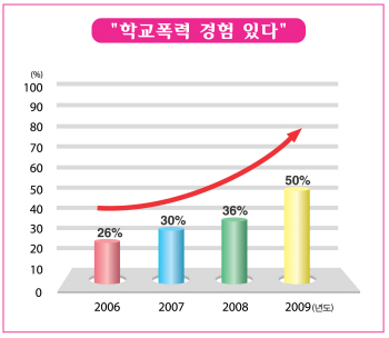“학교폭력(왕따, 욕, 놀림, 구타, 돈을 뺏김 등)을 당한 적이 있나요?”라는 질문에 ‘한 번’ 이 416명으로 27%, ‘네 번 이상’이 230명으로 15%, ‘두 번’이 100명으로 6%, ‘세 번’이 40명으로 2%에 달해 학교폭력 경험이 있는 학생이 모두 50%에 달하는 것으로 나타났다.