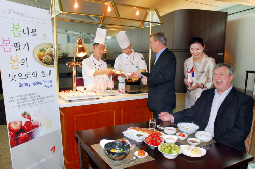 아시아나항공에 따르면 인천공항을 이용하시는 손님들을 대상으로 조선호텔 요리사가 직접 요리하는 봄향기 가득한 봄나물 비빔밥과 화전(花煎), 생딸기 및 딸기쉐이크를 서비스한다.