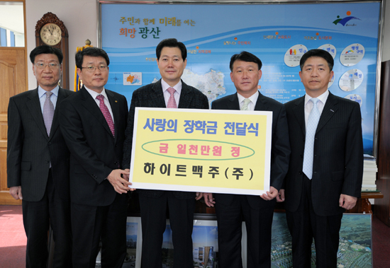 이날 하이트맥주는 이구연 영업본부장(상무)과 광주지점 관계자들이 광산구청을 방문, 전갑길 광산구청장과 구청관계자들이 참석한 가운데 장학금을 전달식을 가졌다. 이 장학금은 광산구의 불우청소년들에게 지원될 예정이다.