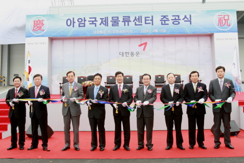 | <대한통운(대표 이국동)은 16일 인천 남항 아암물류 1단지 내에 국제물류센터를 오픈했다. 이국동 사장(오른쪽에서 다섯번째)과 임직원들이 테이프 컷팅을 하고 있다> | ||
