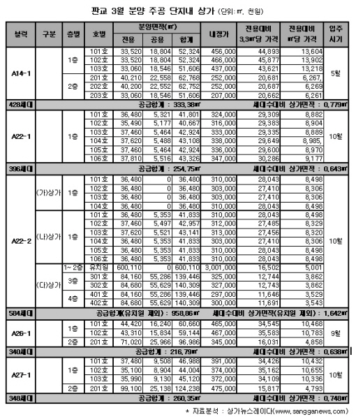 또한 전국적으로 남양주 가운(4개 점포), 고양 일산(3개 점포), 고양 행신(2개 점포), 오산 세교(8개 점포), 광주 용봉(2개 점포), 광주 진월(1개 점포), 속초 청대(3개 점포), 무주 남대천(3개 점포), 대구 매천(1개 점포), 칠곡 북삼(5개 점포), 밀양 삼문(2개 점포), 울산 화봉(1개 점포), 김해 율하(3개 점포) 등 판교를 포함해 3월에만 총 71개의 단지내 상가가 신규 및 재입찰 공급된다.